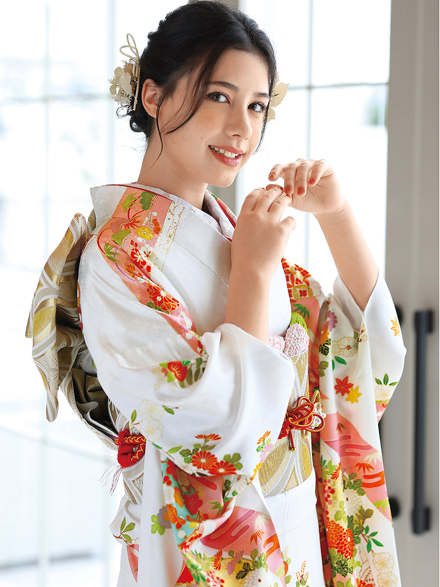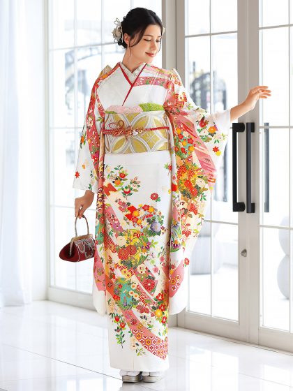 上品な白地に四季の花々や扇面など伝統的な吉祥文様が散りばめられ、華やかさと格調を兼ね備えており、格式がありつつも優美な印象を与えます。古典的で品格ある柄行きは、伝統や正統派の美しさを重視するお嬢様におすすめです。