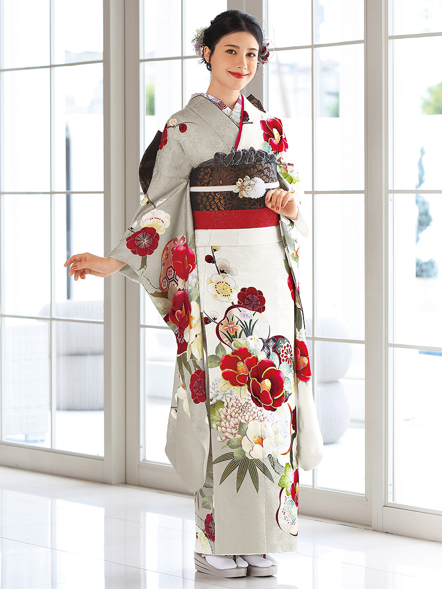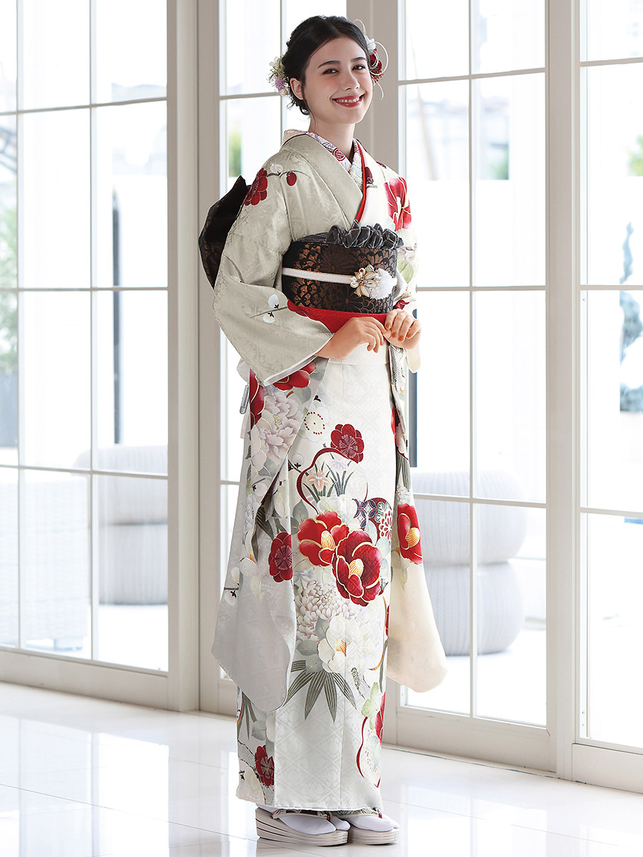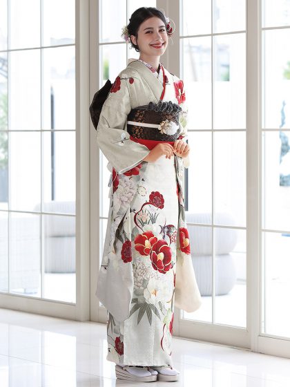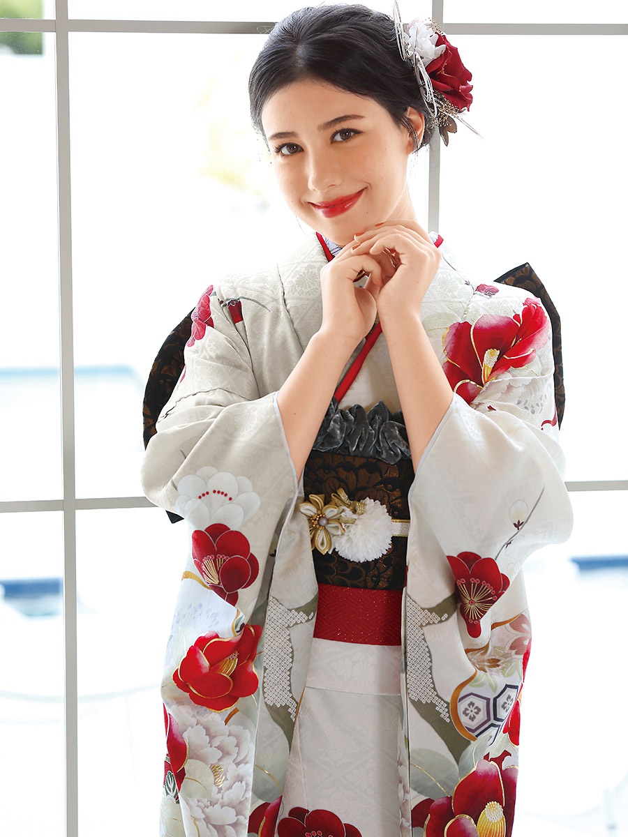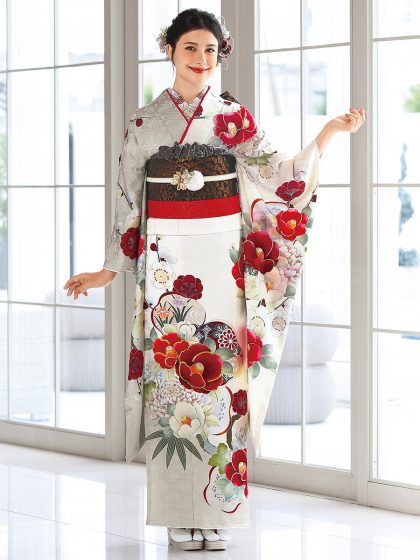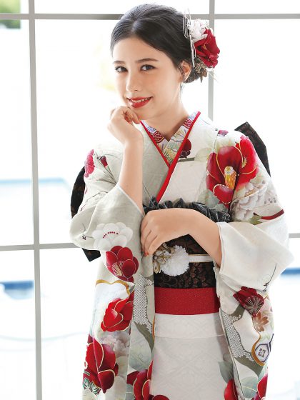 清楚で華やかな白地に大胆に描かれた赤い椿・牡丹がとても華やかで存在感があります。古典的でありながらモダンな雰囲気も持ち合わせており、写真映えも抜群です。「清楚さと華やかさを両立したい」・「大人っぽく見せたい」というお嬢様に!