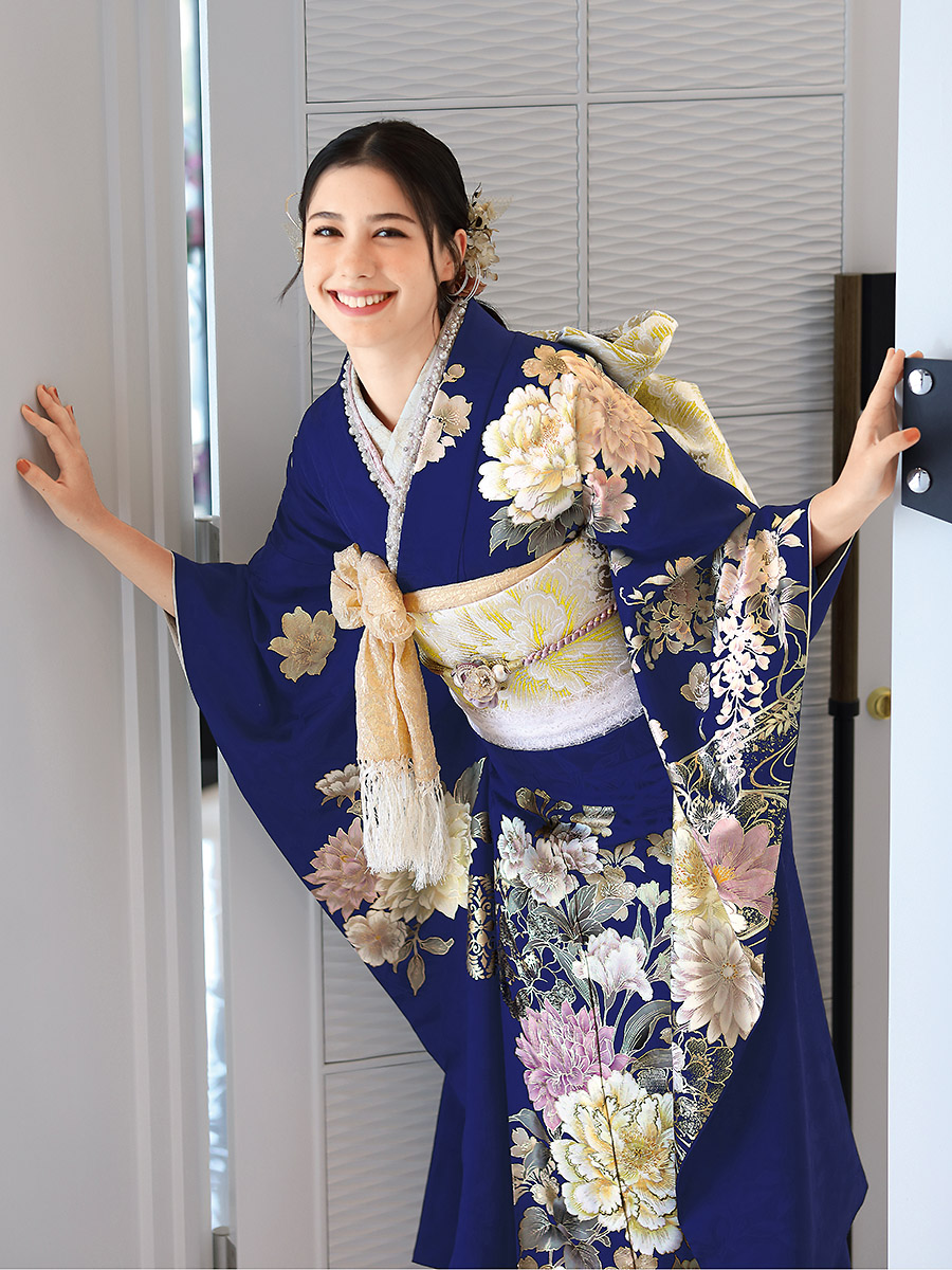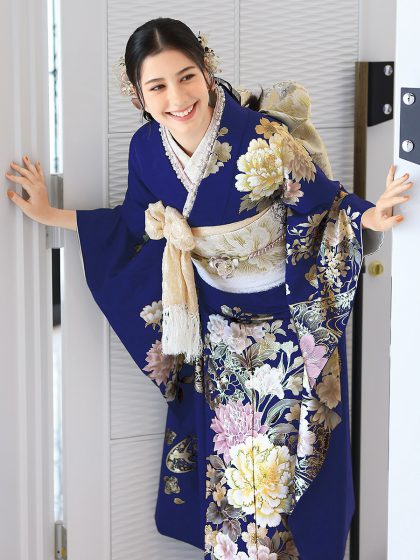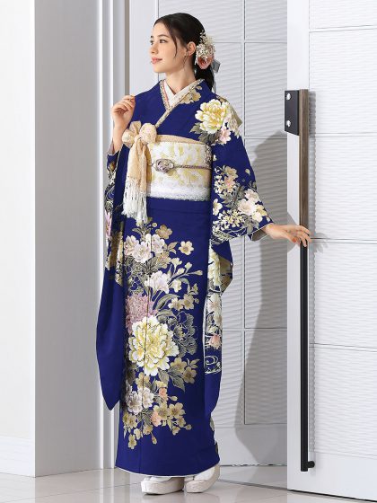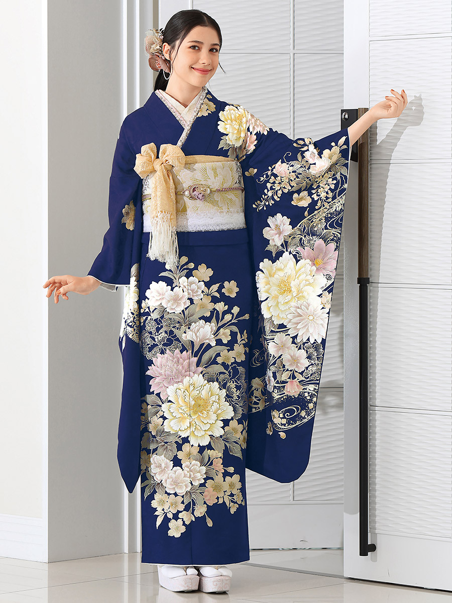 白を基調とした大きな牡丹が華やかにあしらわれ、気品と優美さを演出。上品で落ち着いた紺色は大人っぽさを引き立て、格式高い印象を与えます。成人式やフォーマルな場にふさわしい振袖です。
