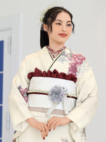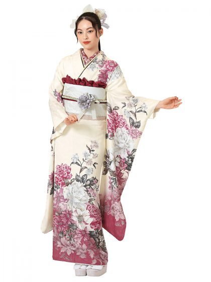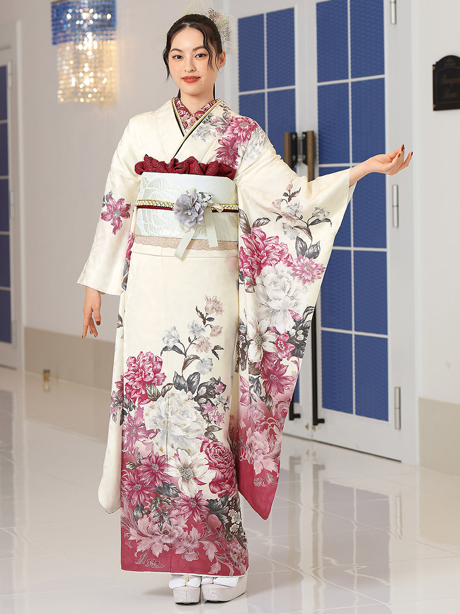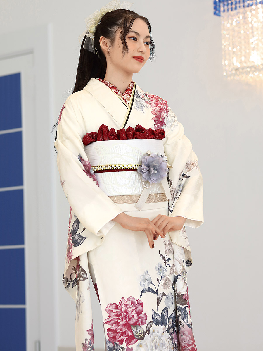清楚で純白のような白地がベースになっており、牡丹やダリアのような華やかな花々が裾から袖にかけて贅沢に描かれています。存在感がありながらも色数を抑えているため、大人っぽく上品にまとまっています。