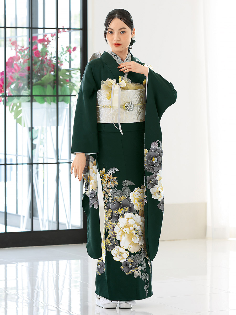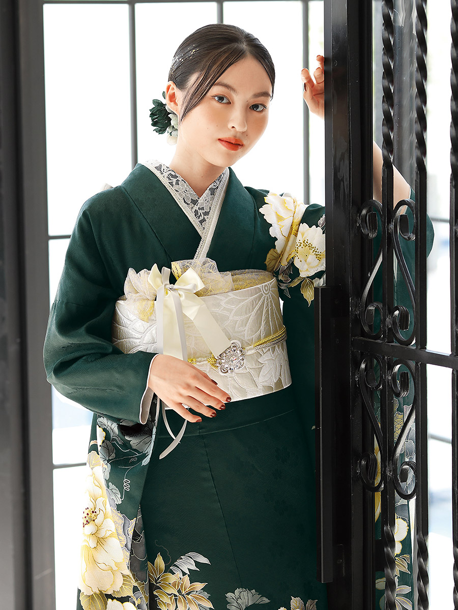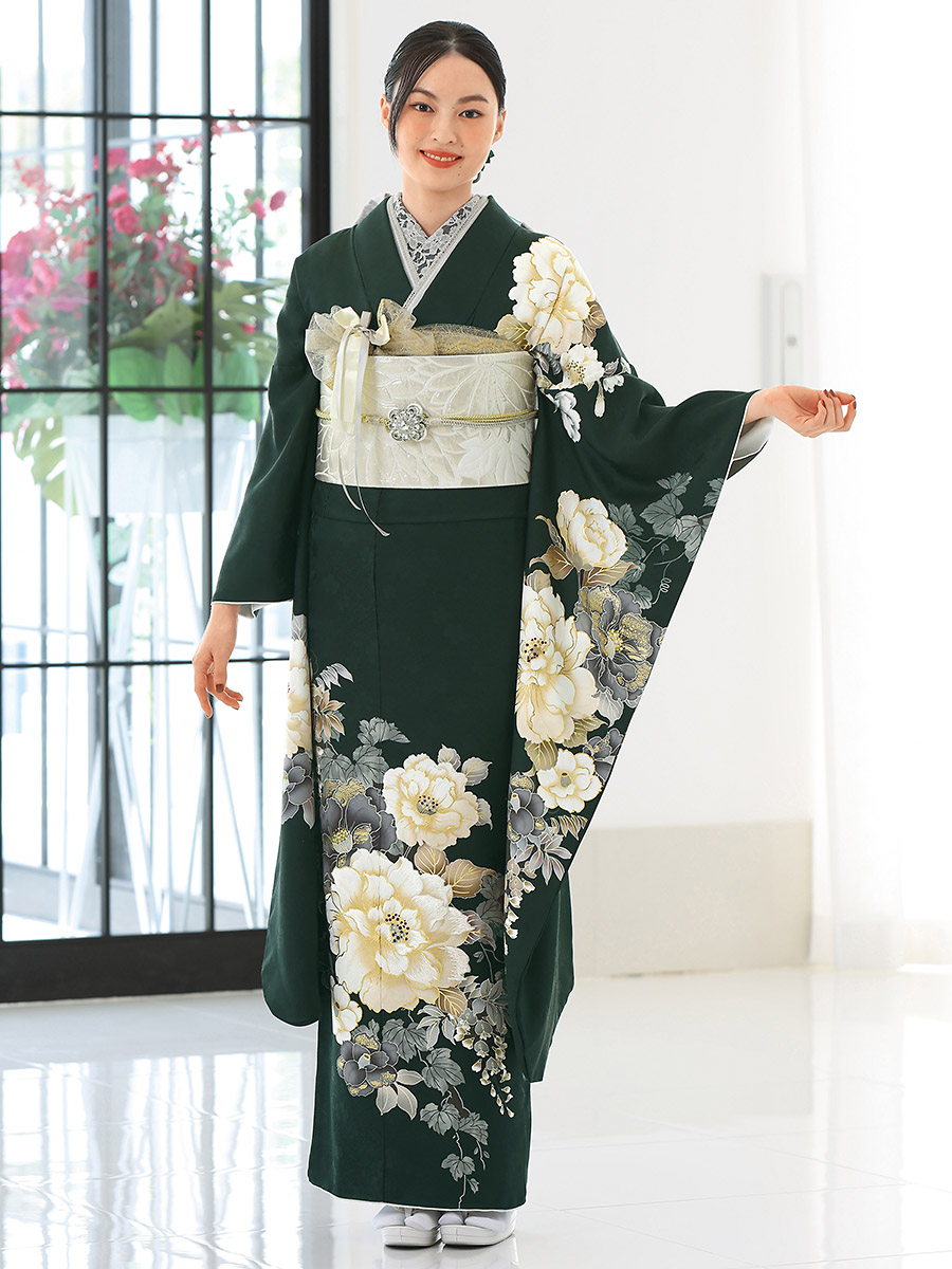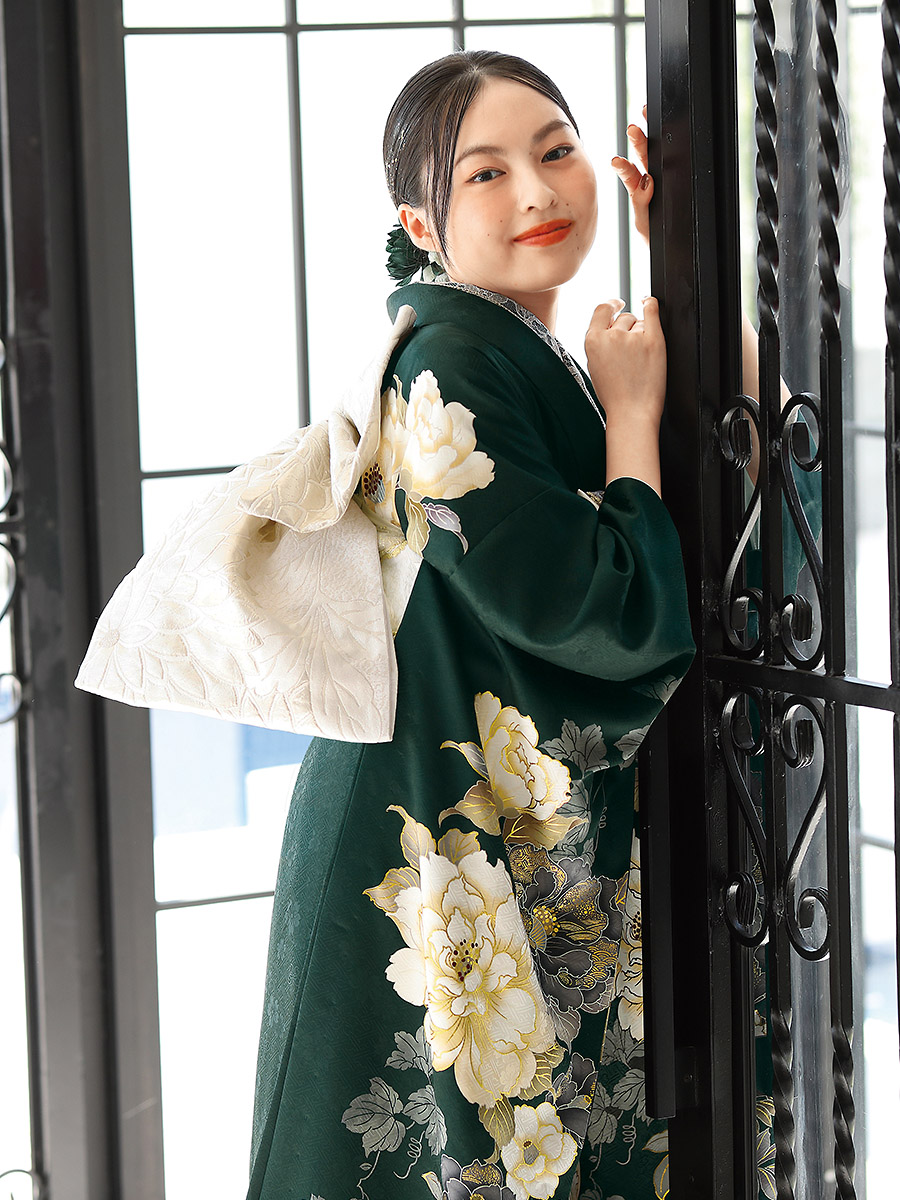 落ち着いた深緑に近い黒の地色に大きな白牡丹が描かれています。柄の色合いがスッキリとまとめられているため落ち着いた上品さがありながら、光の加減で華やかさも演出します。華やかさと品格を兼ね備えた振袖なので、成人式はもちろんご親族の結婚式やお茶席など改まった場にも映える意匠です。