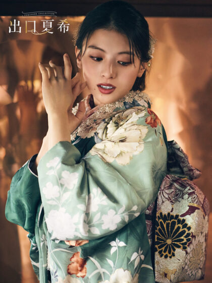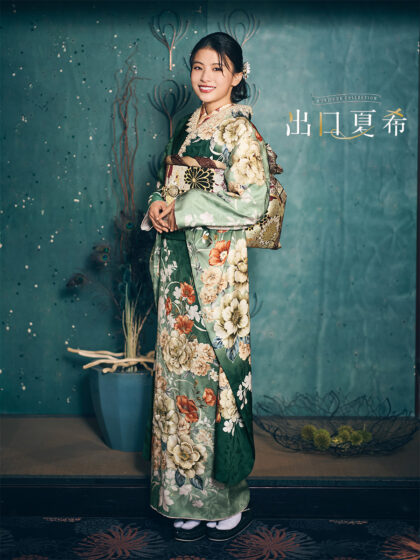 深みのある緑の地色に大輪の牡丹や菊の花が華やかに描かれており、成人式やフォーマルな場にふさわしい意匠です。上品さを大切にしつつ華やかに魅せたいお嬢様ぴったりの一枚です。